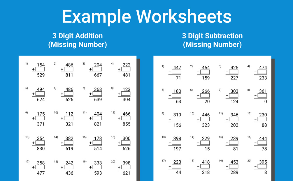 👉 Levels 3-4: Three-digit subtraction, including missing numbers.