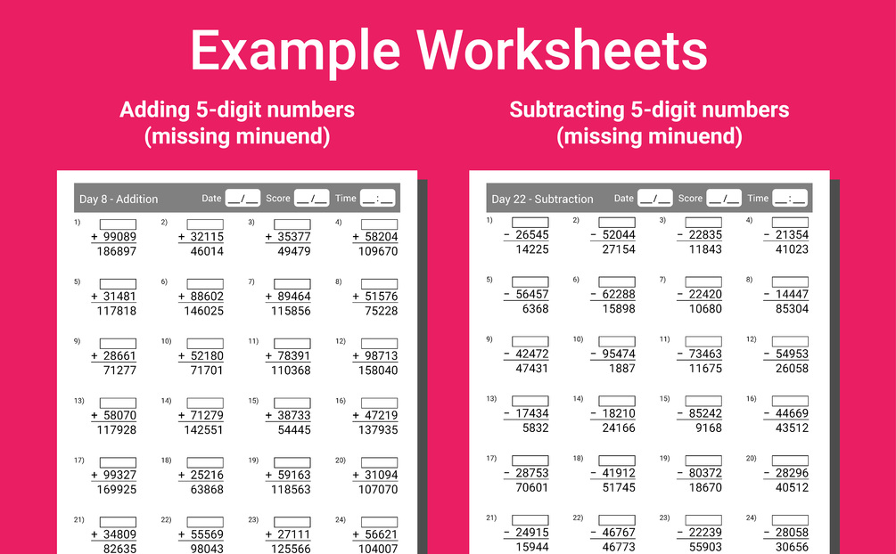 - Day 21 - 24: Subtracting 5-digit numbers (missing minuend)