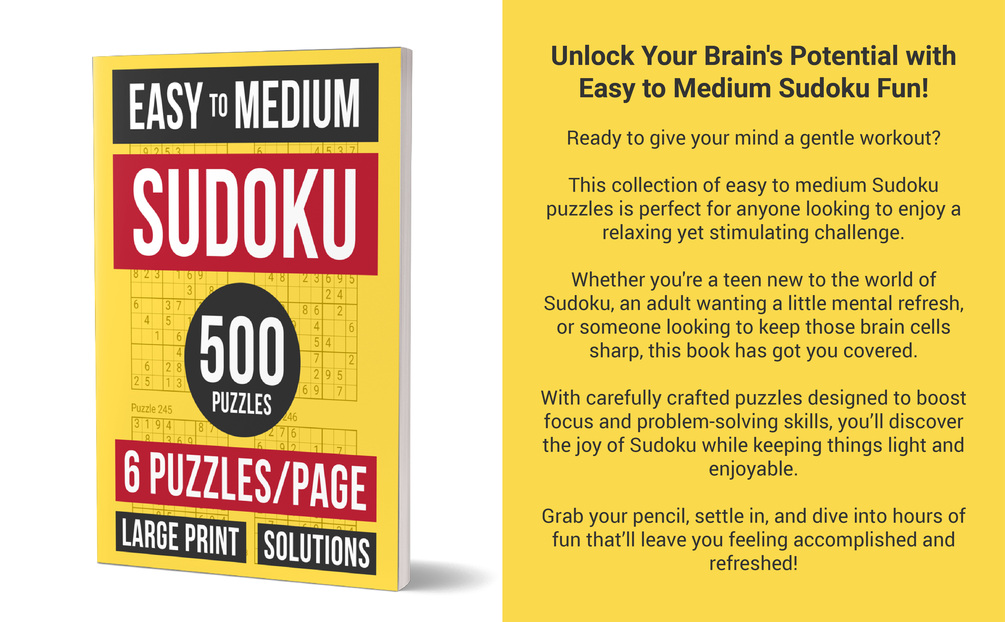 Whether new to Sudoku or looking for a relaxing brain exercise, this collection of 500 easy to medium-level sudoku puzzles is the perfect way to boost your mind without feeling overwhelmed.