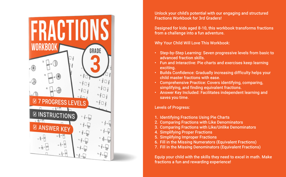 The "Fractions Workbook Grade 3" is designed to captivate young minds and transform fractions from a challenge into an exciting journey.