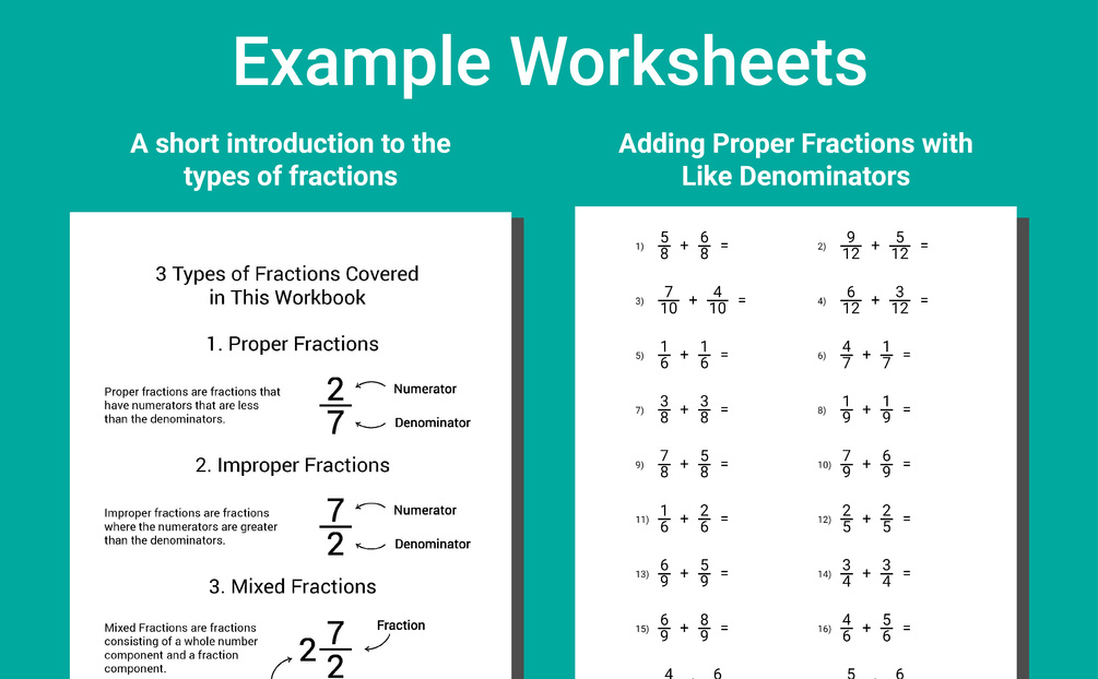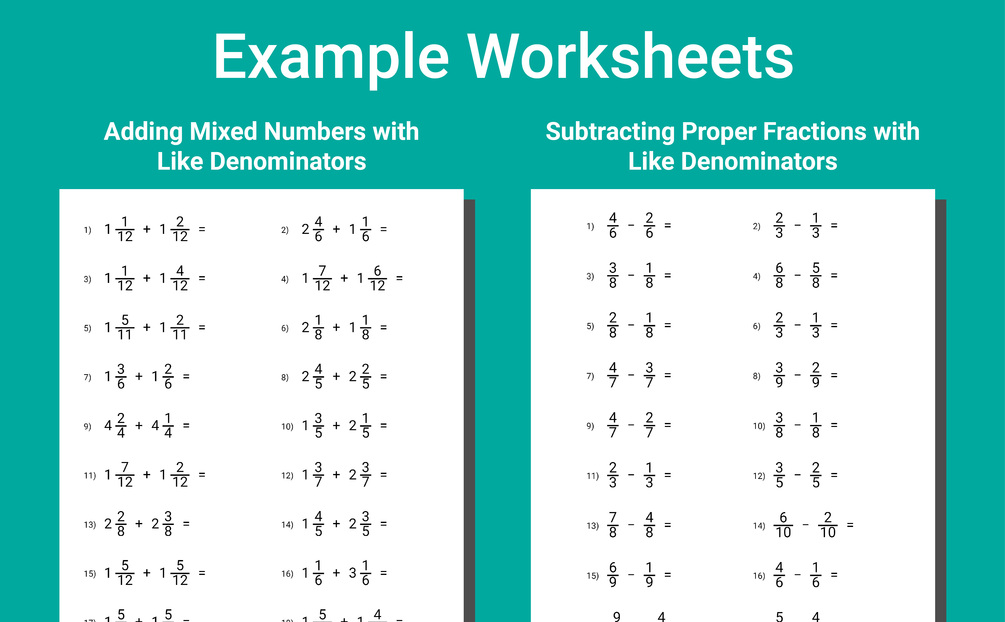 - Comprehensive Practice: All essential topics are covered, from adding proper fractions with like denominators to subtracting mixed numbers with like denominators.