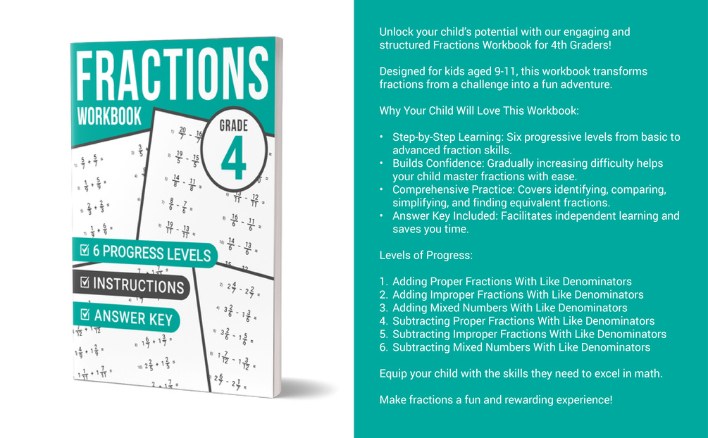 The "Fractions Workbook Grade 4" is designed to captivate young minds and transform fractions from a challenge into an exciting journey.