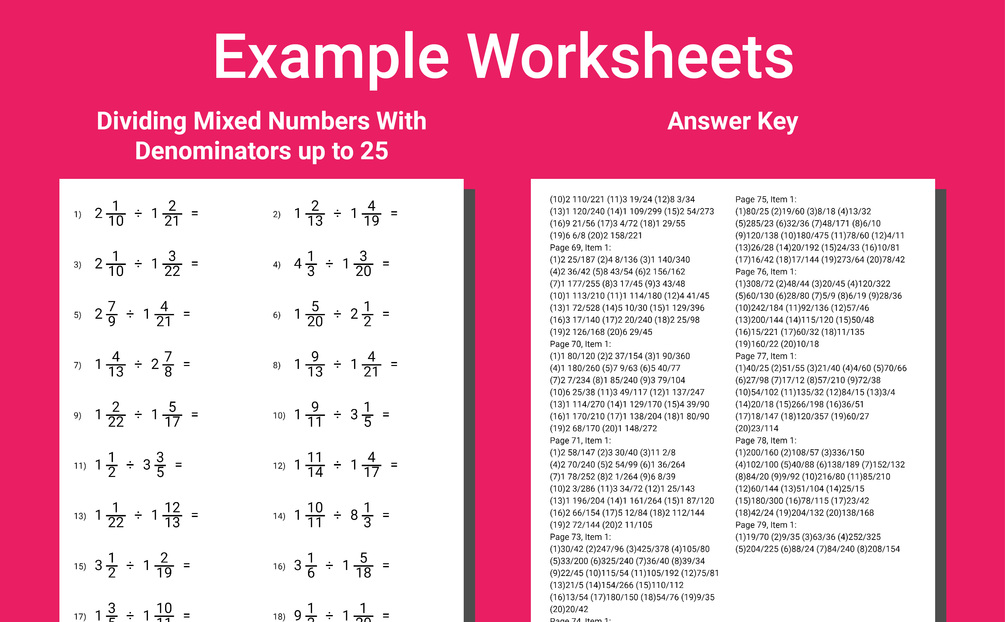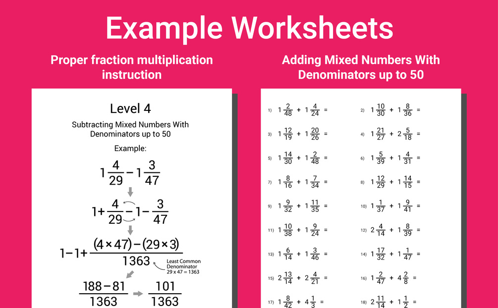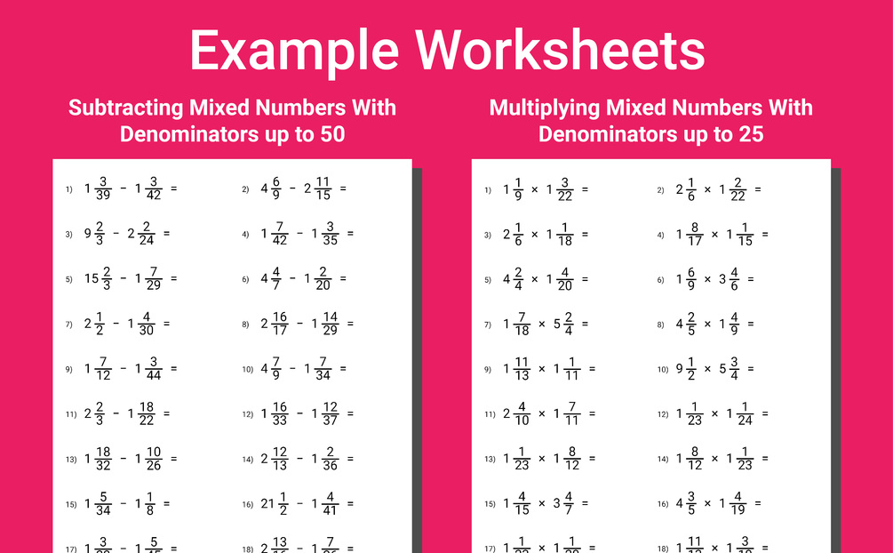 👉 Comprehensive Practice: All essential topics are covered, from adding proper fractions with denominators up to 50 to dividing mixed numbers with denominators up to 25.