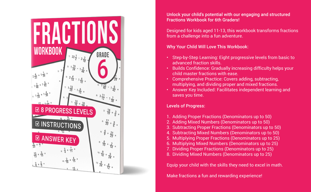 The "Fractions Workbook Grade 6" is designed to captivate young minds and transform fractions from a challenge into an exciting journey.