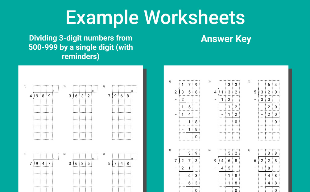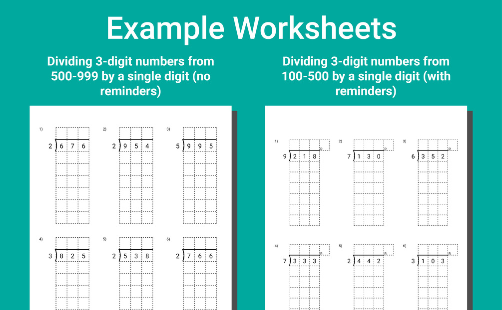 - Dividing 3-digit numbers between 100 and 500 by a single digit (with remainders)