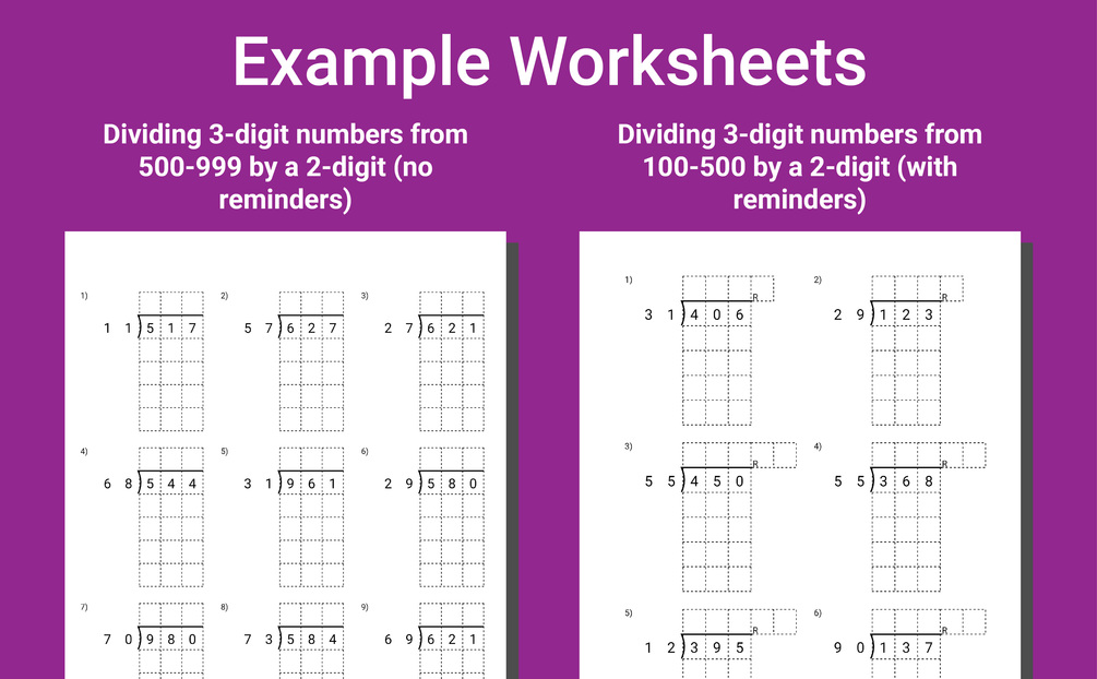 - Dividing 3-digit numbers between 500 and 999 by a 2-digit (with reminders)