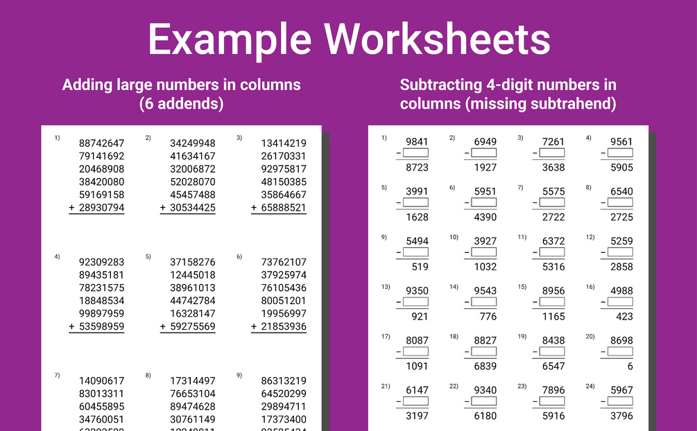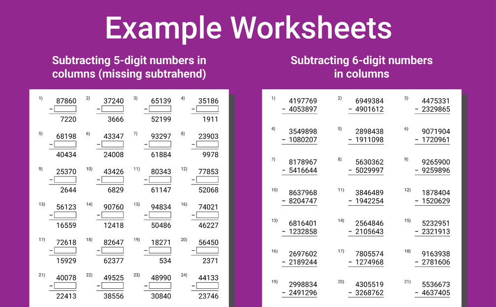 - Level 8 - Subtracting 5-Digit Numbers in Columns (Missing Subtrahend): These exercises increase complexity to ensure students are comfortable with more significant numbers.