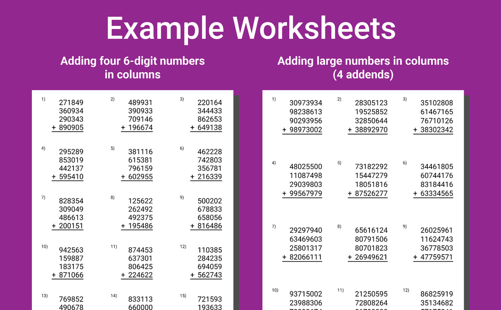 - Level 4 - Adding Large Numbers in Columns (5 Addends): These increasingly complicated exercises prepare students for even more advanced arithmetic.