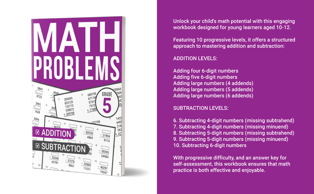 The “Math Problems for 5th Graders – Addition and Subtraction Exercises for Kids Ages 10-11” workbook is designed to address these challenges head-on.