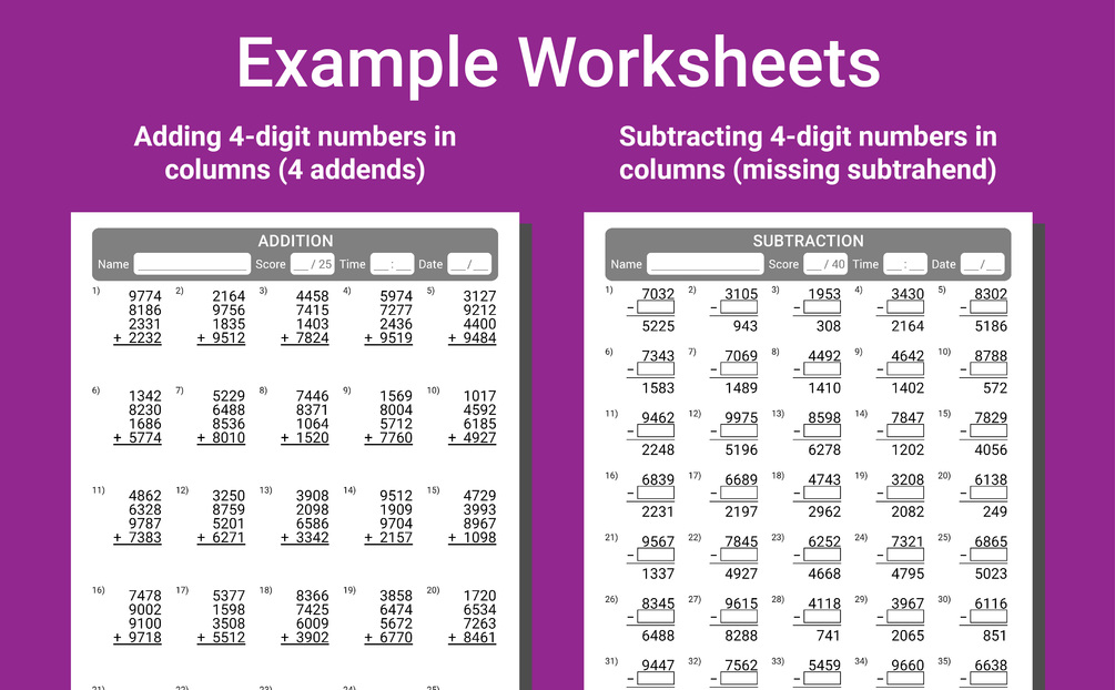 For example, students begin with basic addition and subtraction before moving on to problems with missing numbers and larger digits.