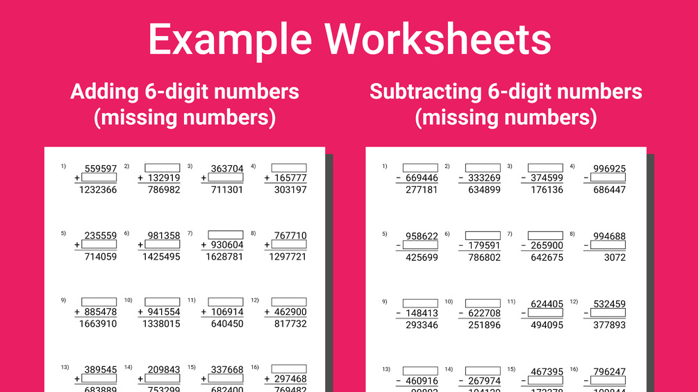 ▸ Addition & Subtraction: Adding and subtracting 6-digit numbers with missing numbers.
